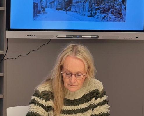 Frau Dr. Leps führte in den Film ein und erläuterte an verschiedenen Stellen zum einen die nur lose an historischen Tatsachen orientierte Handlung, zum anderen die künstlerischen Elemente. So werden wiederholt aus Gemälden bekannte Szenen nachgestellt. Auch spielten natürlich die Drehorte zwischen Münster (Kinderhaus), Haus Hülshoff (Havixbeck) und der Burg Gemen eine wichtige Rolle bei dieser Vorführung. Interessant war zum Beispiel der Bauzustand des Tores mit der funktionierenden Zugbrücke.