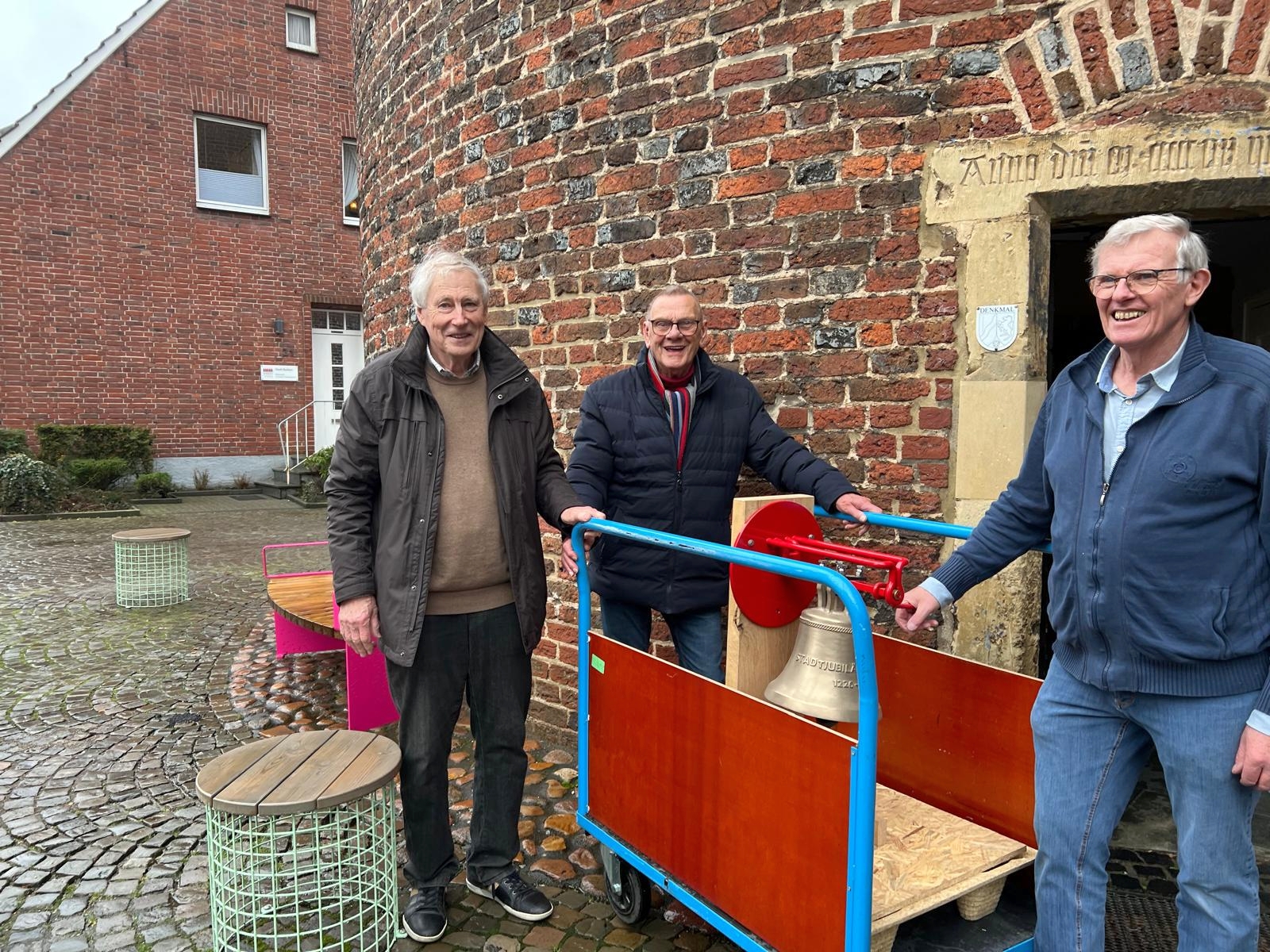Auf einem Wägelchen herangefahren aus dem Farb, wo sie ein paar Tage auf das große Ereignis warten musste: die fast noch gussfrische Glocke, bewacht vom Hausmeister Wilfried Raap (rechts) sowie unserem Vorsitzenden Berni Wissing und Beisitzer Hans Essing (von links). BF