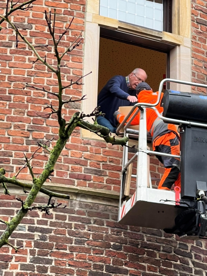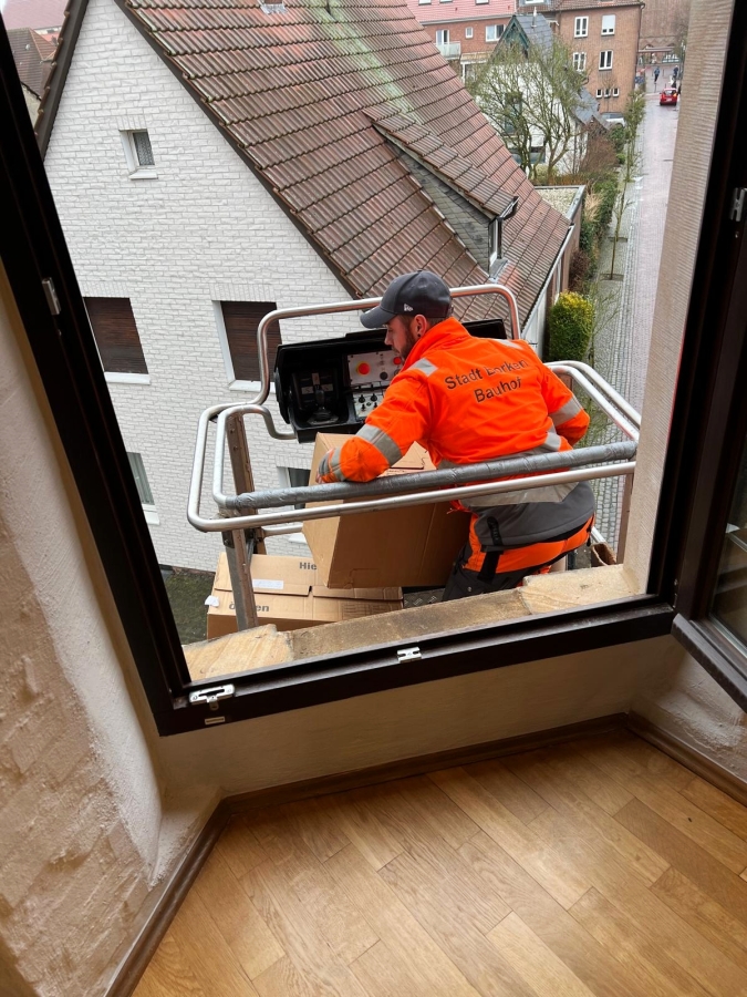 Jeder, der schon einmal selbst umgezogen ist, weiß, was Kartons mit Büchern und Aktenordnern und und und wiegen. So versteht sich, dass wir die Chance wahrnehmen mussten, uns mit einem Hubsteiger helfen zu lassen, was die freundlichen Mitarbeiter des Bauhofs auch gerne taten.
