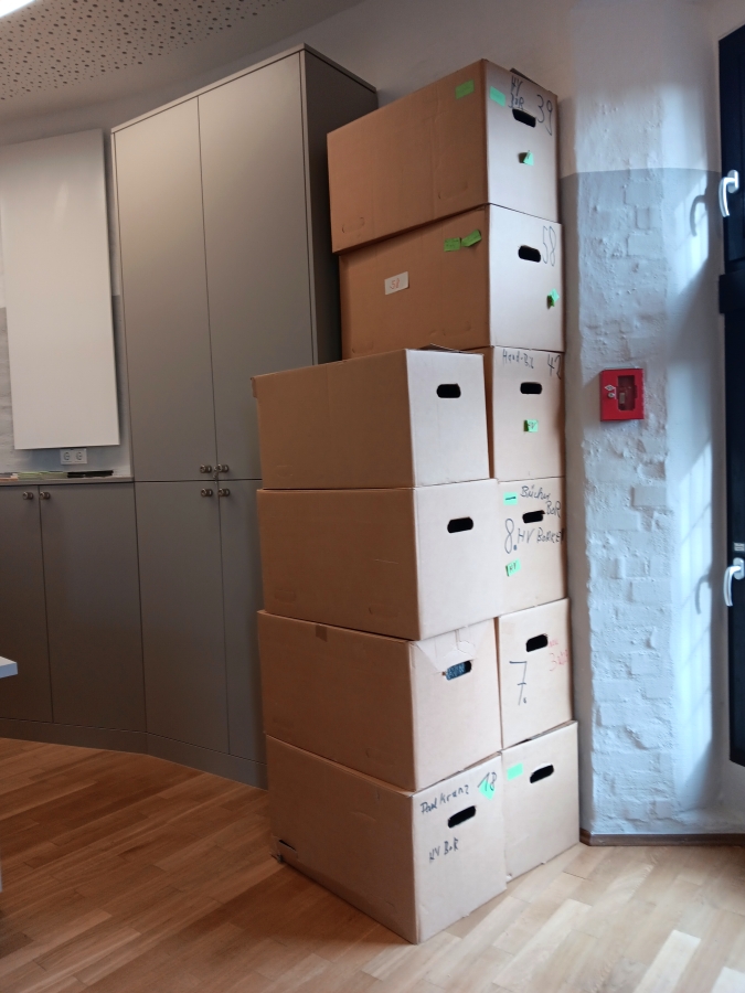 Inzwischen sind diese Kartons alle leer und der Inhalt in den Regalen und Schränken verstaut. BF